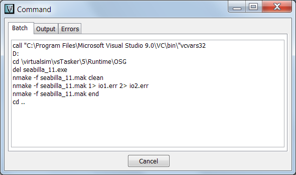 This window displays the batch builder, usually embedding an external compiler call.