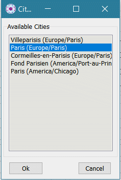 If the city is found, it will be displayed in the Available Cities list (window below). If several cities exist under the same name, just select the one you want and click OK.