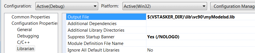 In the myModels properties window, change the name of the library to: $(VSTASKER_DIR)\lib\vc90\myModelsD.lib (vc90|vc100|vc140...) and D for debug, nothing for release.