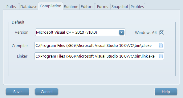 If Visual Studio has been installed on another partition, make sure to change it on the Compiler and Linker text fields. Save.