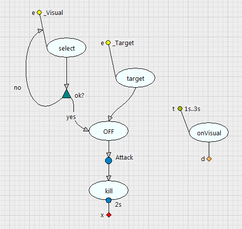 Whenever an entity detects something around it (_Visual event), it selects randomly one "target" which is not already in a duel, then informs this target about a duel by sending it an event _Target. This events switch off the visual sensor then start the Attack. One of the two entities will be killed. The winner will restart the logic and fight again. The scenario stops when only one entity is left.