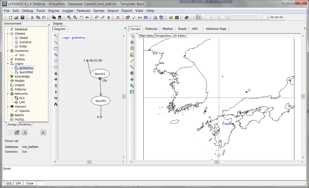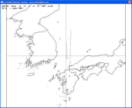 On this sample, red ballistic missiles are intercepted by blue missile interceptors. They have their own collision model. The grey line in front of them shows the planned interception point. To avoid missile the target with high relative speed and angle, the pursuit & collision model put the missile interceptor right behind the target).