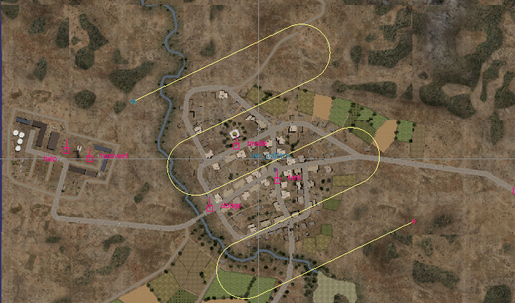 In this example, a UAV will follow a search pattern (in yellow) while on the ground, several cars and vehicles will move along the roads.