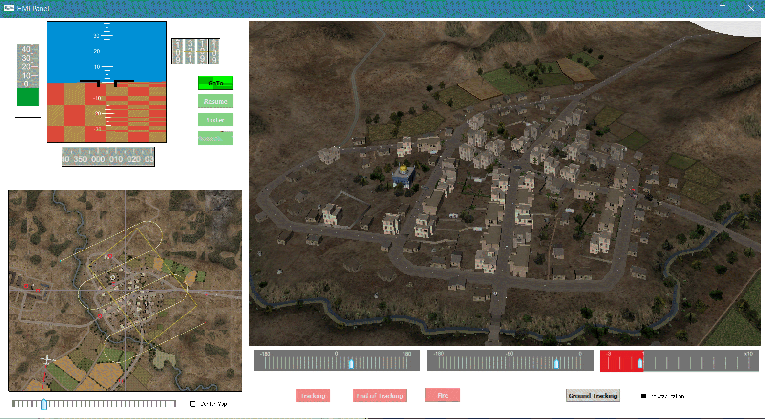 On the HMI user panel, the player will be able to control the camera payload mounted on the belly of the UAV. By playing with the various sliders, he will be able to rotate the payload and zoom to observe the situation from the sky.