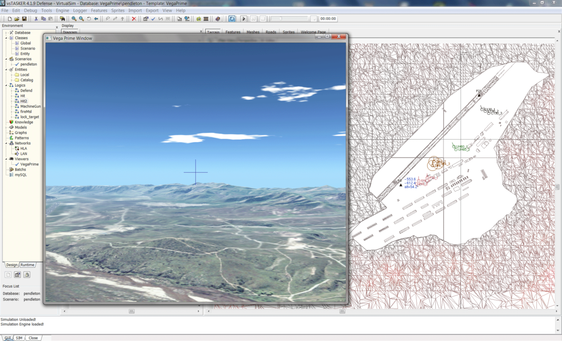 Open Pendleton database in data/samples/VegaPrime directory. You need to have a game pad (Logitech) attached to your computer in order to control the fighter.