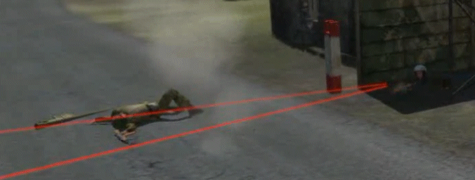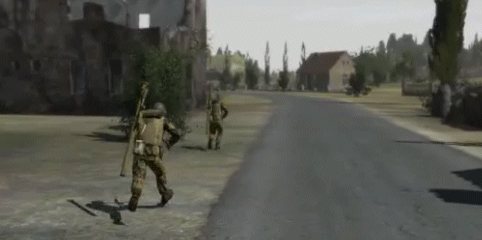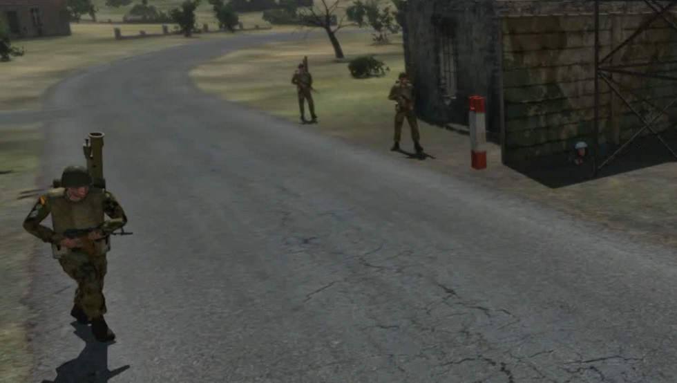 Ready to engage against the opponent tank. See the sniper with the white helmet on the right, in the shadow of the wall: