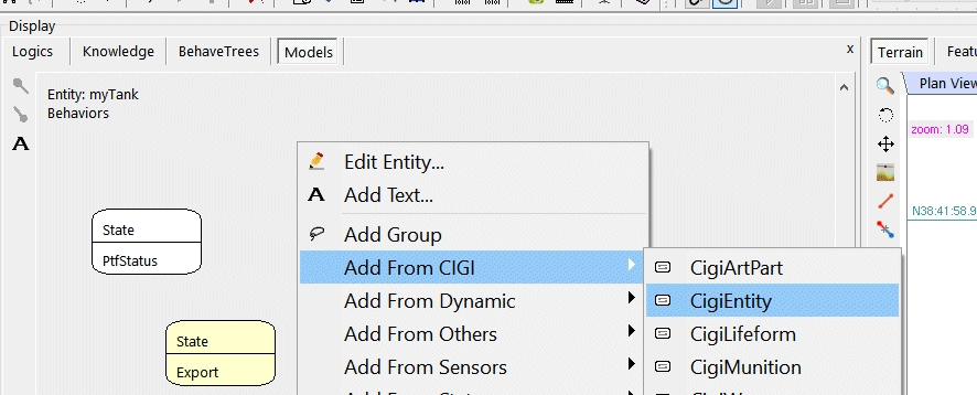 Now, open the terrain corresponding to the one in the IG (or set the same coordinates in vsTASKER) and add a Tank. Drop on the map a default entity then name it myTank.