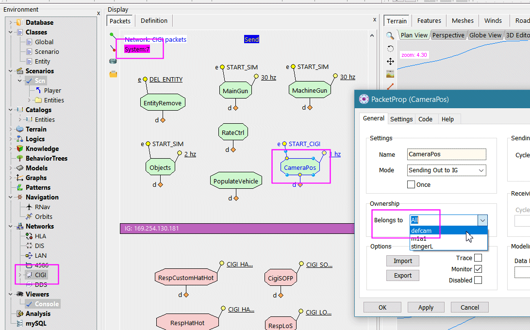 Below, camera focused on defcam entity. You can drag it on the map to explore the area in 3D (this works best with 2 screens).