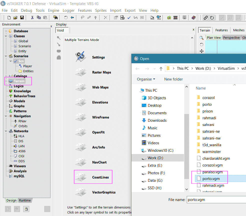 Click on Environment::Terrains then VectorGraphics and select Porto.vgm :