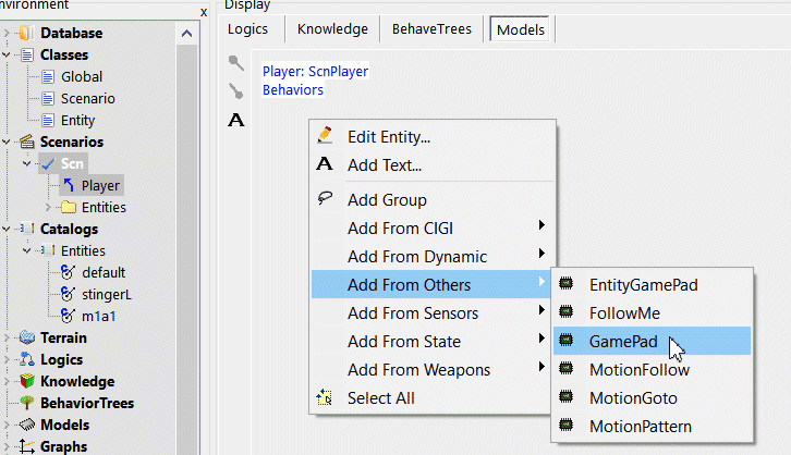 Now select the Scenario Player and give it the Player logic and the Gamepad component: