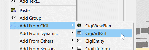 Right-click on the CIGI Group background and select the CigiArtPart model: