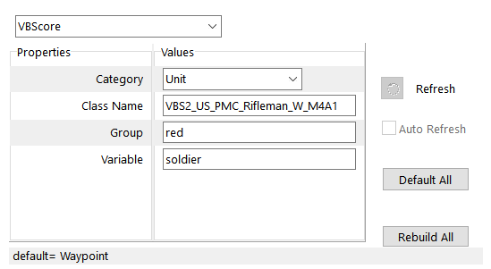 For the VBScore definition of a single soldier, select Unit then in the Class Name, put the full VBS name as it can be retrieved from the VBS GUI itself.