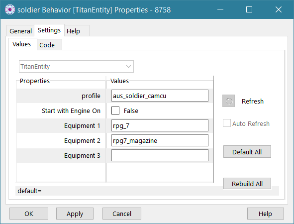 If the entity need equipments or weapons, list them with their Titan type name. Either refer to the documentation of Titan or find the name in the appropriate window or text field in Titan.