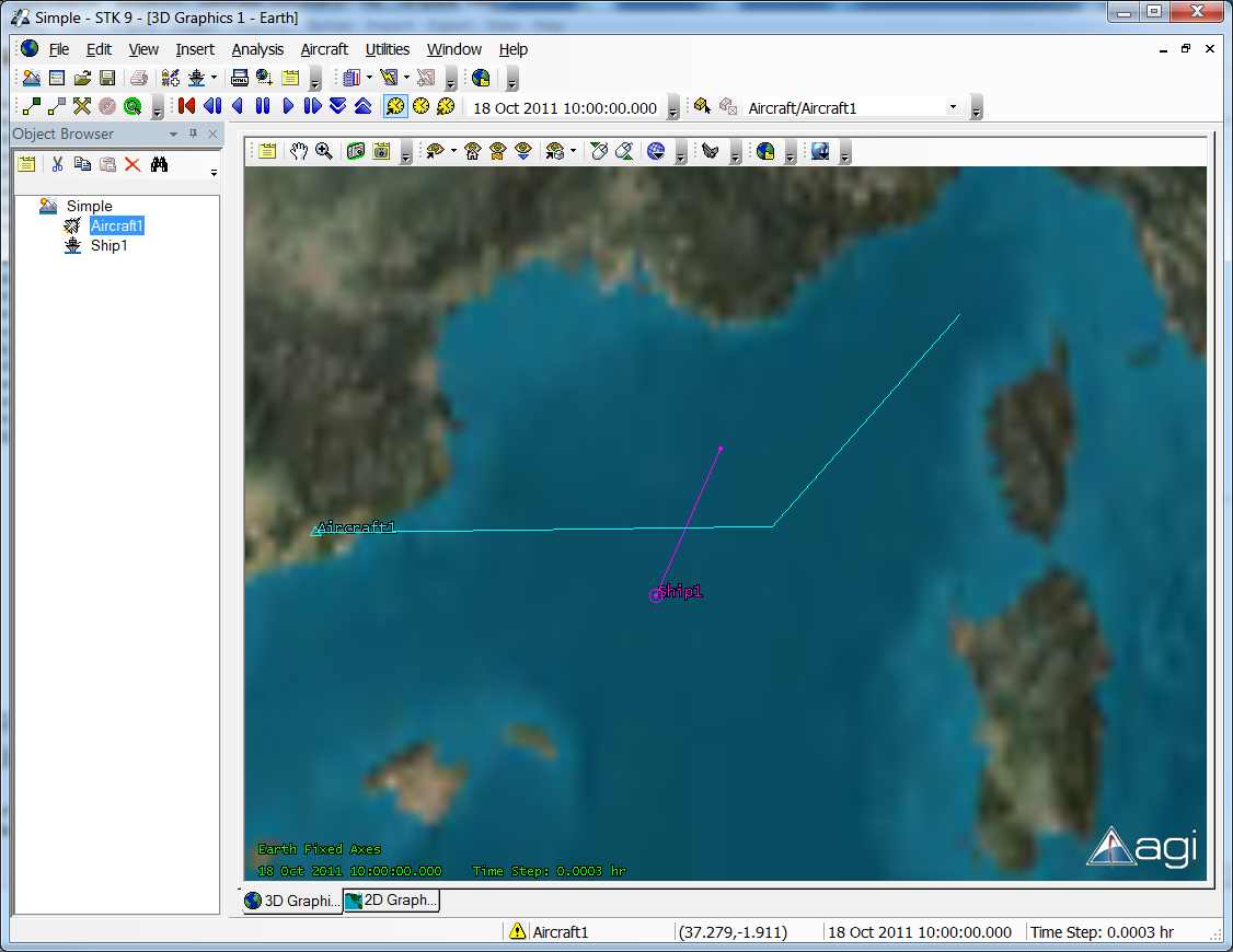 The idea is that Aircraft1 and Ship1 will meet, so that a sensor mounted on Aircraft1 will be able to detect Ship1.