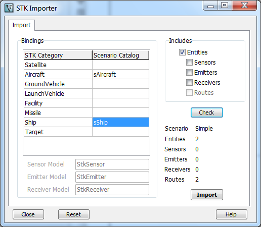 As we want to import the Aircraft and the Ship, we will only select the two Catalog entities to match the STK corresponding Category.