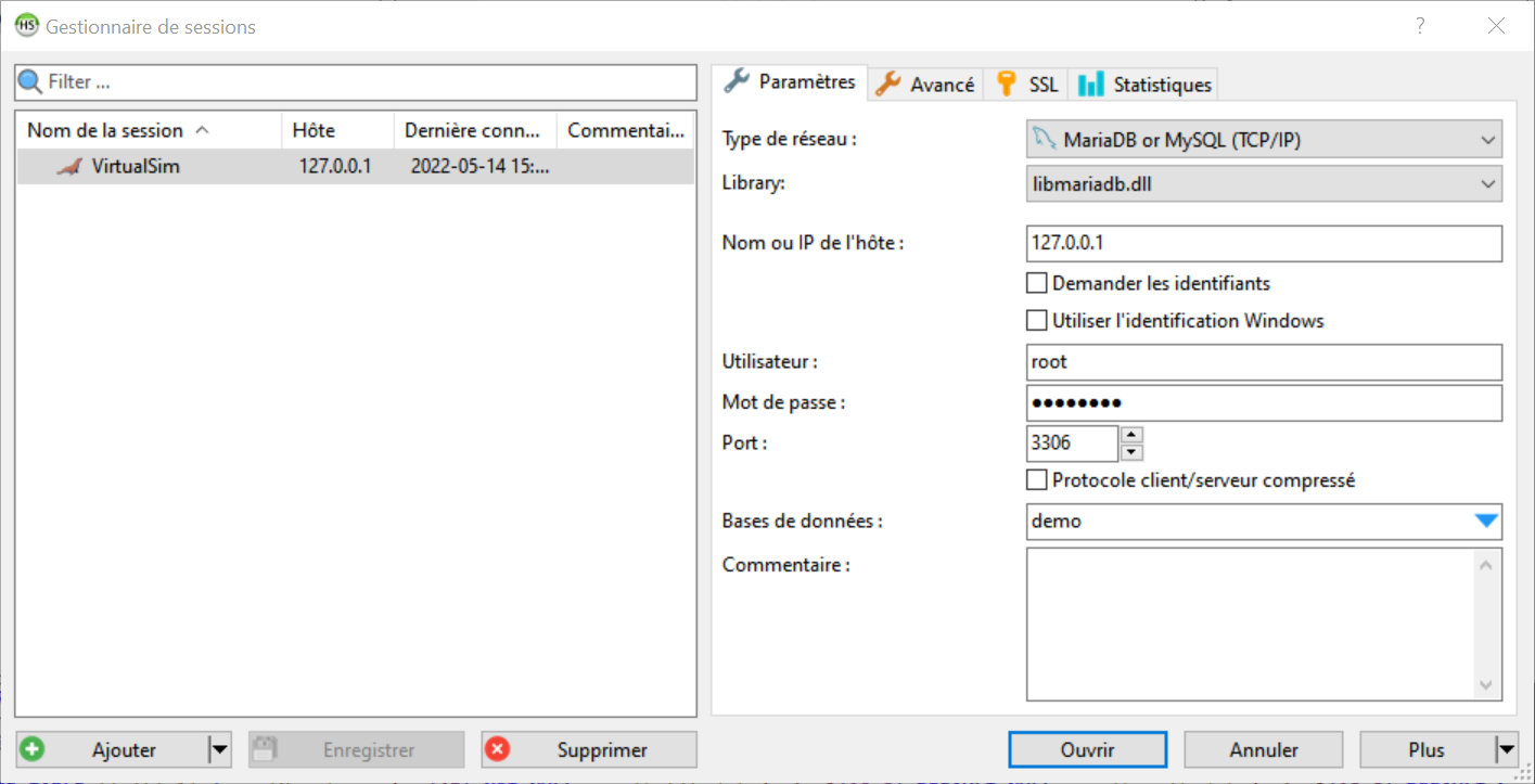 Name the session whatever you want, and give the root password you setup on the server side. Select the database demo: