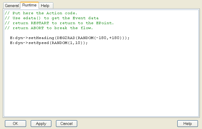 In the Runtime pane, you will enter the code that will be executed (by the simulation engine) as soon as the Action object is triggered.