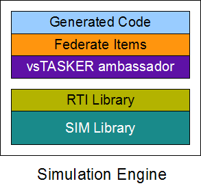 The following picture roughly describes the content of an HLA simulation engine produced by vsTASKER: