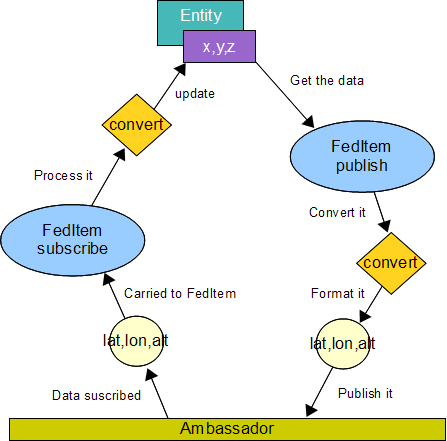 For example, a FedItem Object that will publish the position (x,y,z) and the name (string) of an entity will create one context for each scenario entity that will use it, either to publish their positions to the Federation, or to update their position from a remove federate.