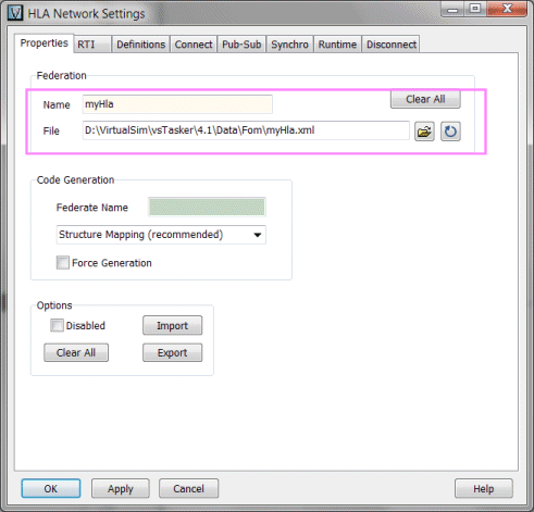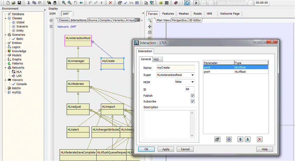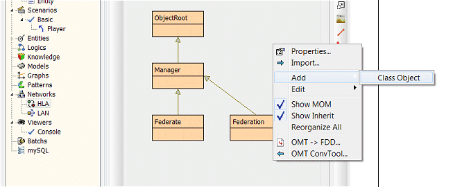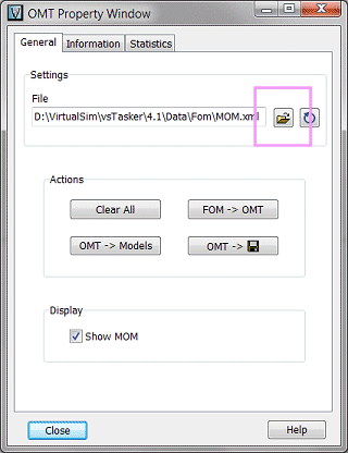 Go to the HLA::OMT panel, then select Properties and load a MOM file into Data/Fom directory (change the file type from OMT to XML)