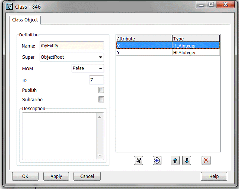 Add the two Attributes by defining each of them: (Name: X, Type: HLAinteger), (Name: Y, Type: HLAinteger)