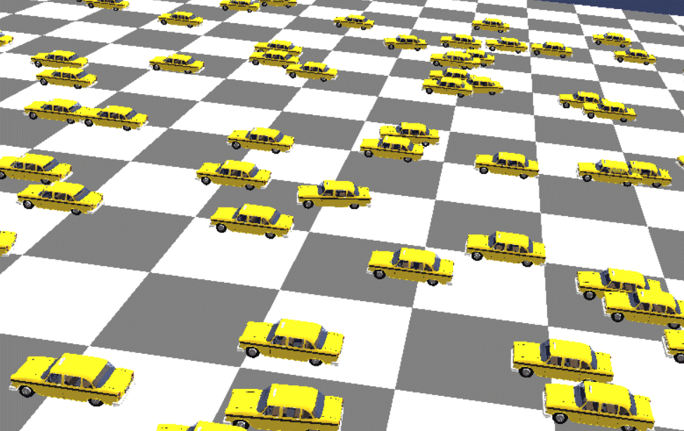 In this OpenScenGraph demo, the simulation host will create 100 cars and randomly move them on a default gaming area.
