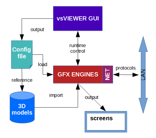 vsVIEWER is a 3D scene generator based on different graphic engines (or image generators). It's unique configuration is described in the below diagram.